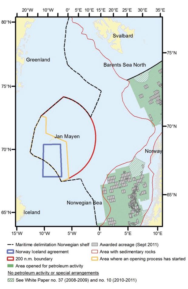 The joint development area extends approximately 12,720 square kilometres on the Icelandic side of the maritime boundary, and 32,750 square kilometres on the Norwegian side and provides that a 25 per cent share in petroleum activities from the JDA inside the boundary of one state shall go to the other state. The Agreement provides for the unitisation of deposits which straddle the JDZ and either country’s OCS outside the JDA.
